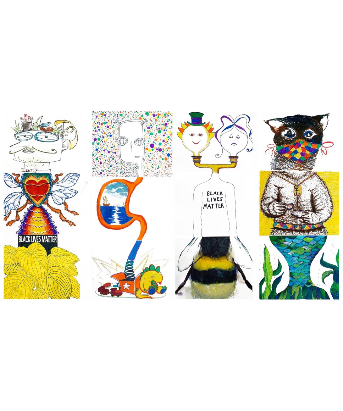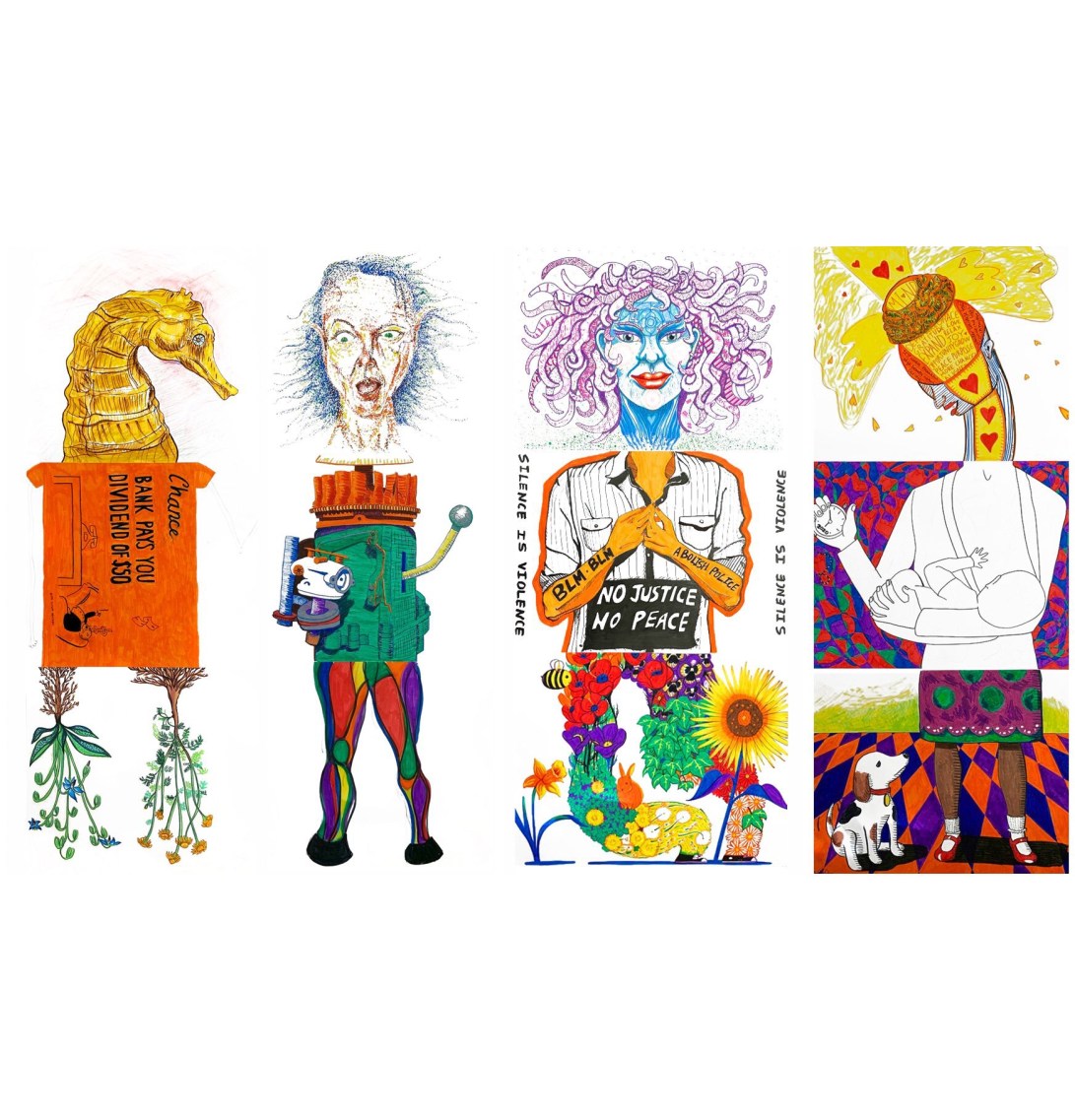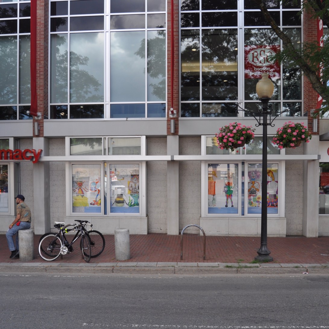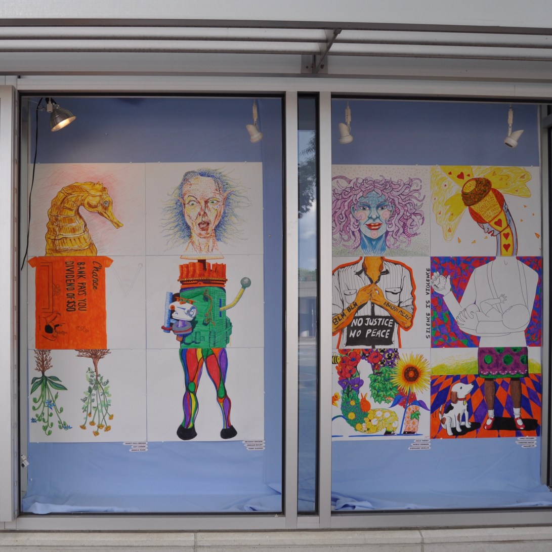 I am excited to announce that my piece is now on view in The Exquisite Corpse collaborative show at the Inside Out Gallery in @davis_sq_somerville (the windows outside CVS). Huge thank you to @geismarart, @stepinhoney, @masscultural and @somervilleartscouncil for making this happen! The artwork of @vidiodo and Bethany Ericsson make up the figure I worked on. #exquisitecorpsesomerville #publicart #communityart #artbeat2020 #fun #somervillecreates #markers #chance